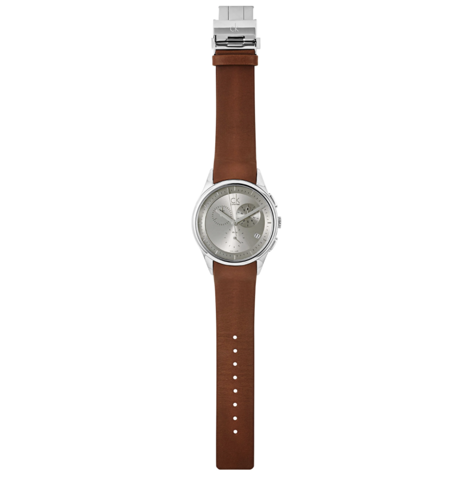 Коричневый кожаный ремешок шириной 22 мм с раскладывающейся застежкой (deployment clasp) делает часы комфортными для ежедневного ношения и добавляет теплый классический акцент дизайну. Водостойкость 50 м (5 ATM) подходит для повседневного использования.
