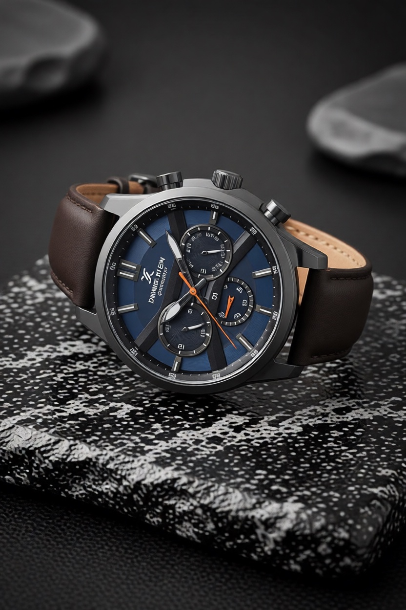 Элегантный дизайн — серый корпус и синий циферблат создают благородный контраст, а коричневый кожаный ремешок добавляет изысканности образу.