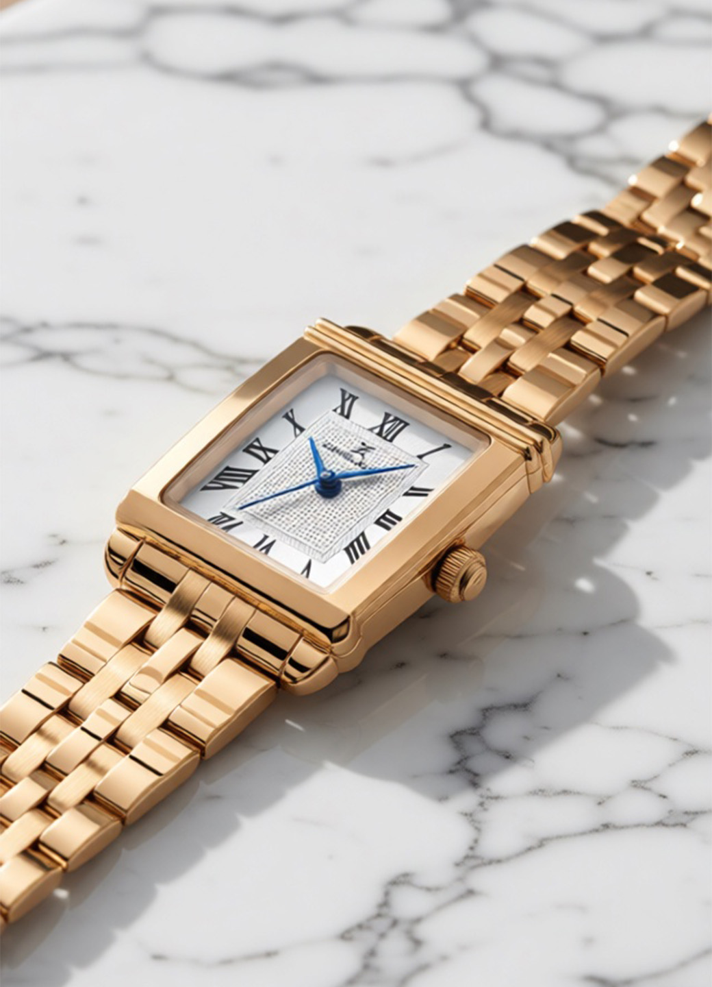 Прямоугольный корпус — современный дизайн, который выделяет модель среди классических круглых часов и подчёркивает модный вкус владелицы.