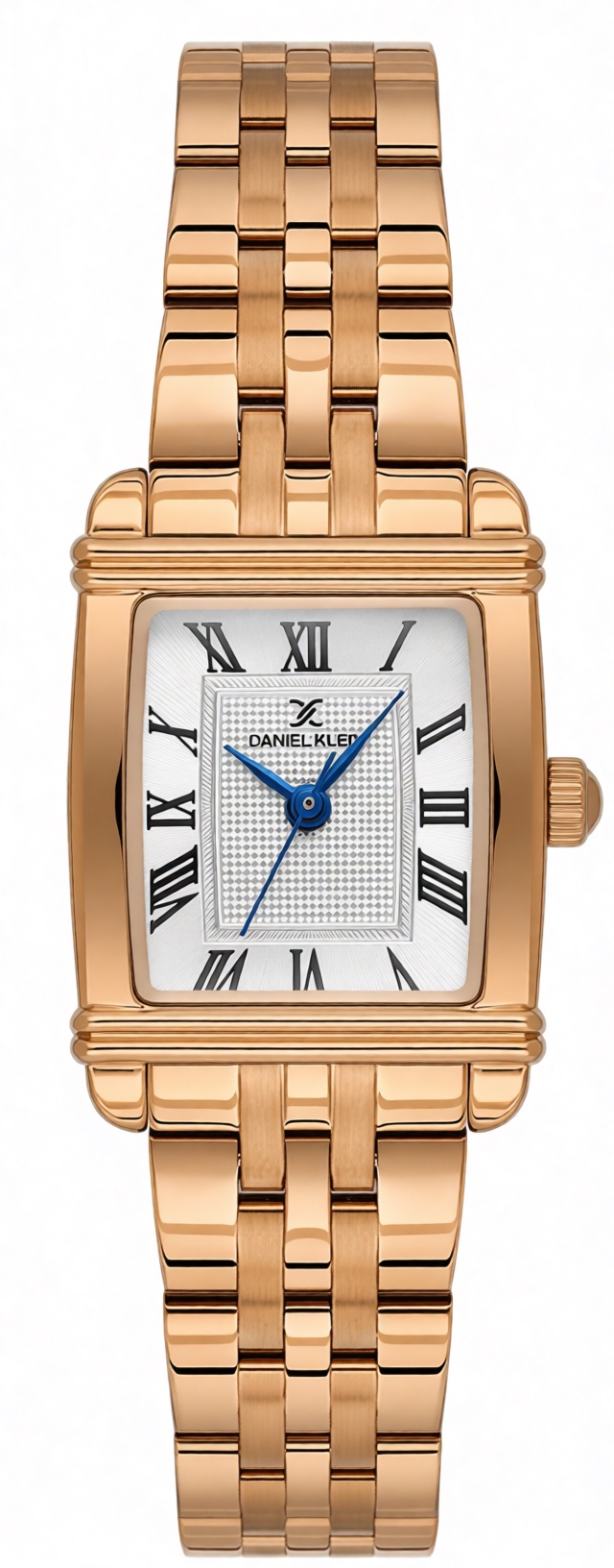 Daniel Klein DK14115‑5 — элегантные кварцевые часы для современных женщин, которые ценят утончённый дизайн и надёжность. Прямоугольный корпус цвета розового золота в сочетании с серебристым циферблатом и римскими цифрами создаёт изысканный образ, подчёркивающий индивидуальность и чувство стиля.