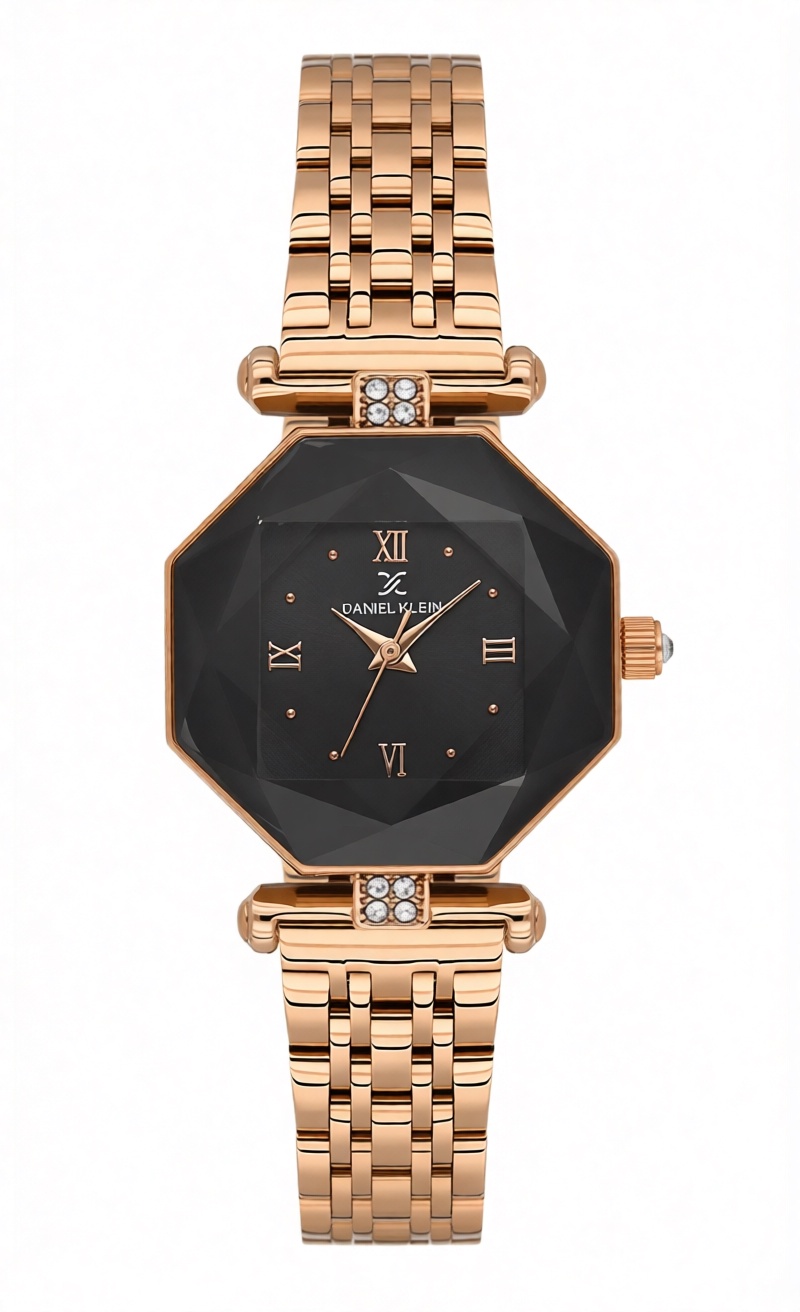 Daniel Klein DK14131‑5 — стильные кварцевые часы для женщин, которые ценят нестандартные решения и элегантность. Восьмиугольный корпус цвета розового золота в сочетании с чёрным циферблатом, украшенным стразами, и браслетом из нержавеющей стали создаёт эффектный образ, подчёркивающий индивидуальность и чувство стиля.