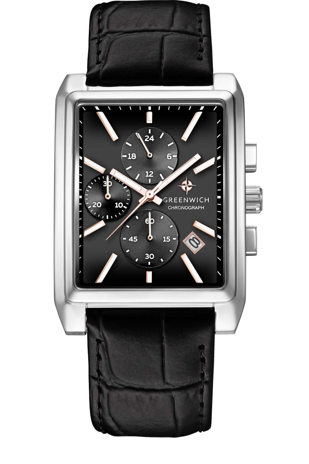Greenwich Galeon Chrono GW 553.11.15 — мужские наручные часы, сочетающие спортивную функциональность и классическую элегантность. Прямоугольный корпус выполнен из нержавеющей стали цвета белого металла, что придает модели строгий и универсальный характер.