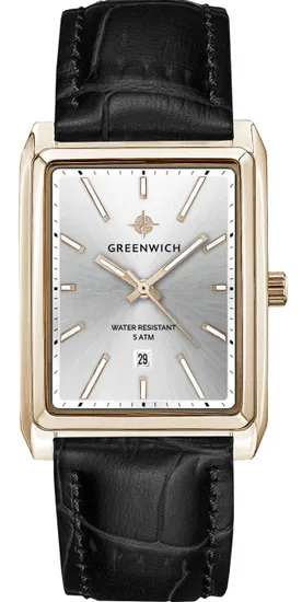Ремешок из натуральной чёрной кожи удобно фиксируется на запястье с помощью классической застёжки-пряжки из нержавеющей стали с логотипом Greenwich. Водозащита 5 ATM позволяет использовать часы в повседневных условиях, не снимая их при контакте с водой.
