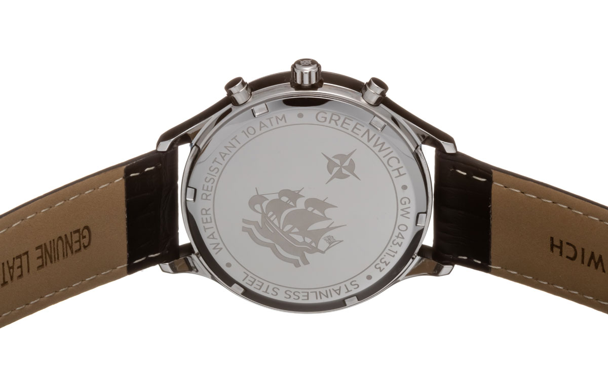 Модель комплектуется плотным черным ремешком из натуральной кожи с прошивкой в тон. Фирменный акцент бренда — логотип в виде розы ветров на заводной головке и задней крышке, а также гравировка корабля, символизирующая дух путешествий и стремление к новым вершинам.