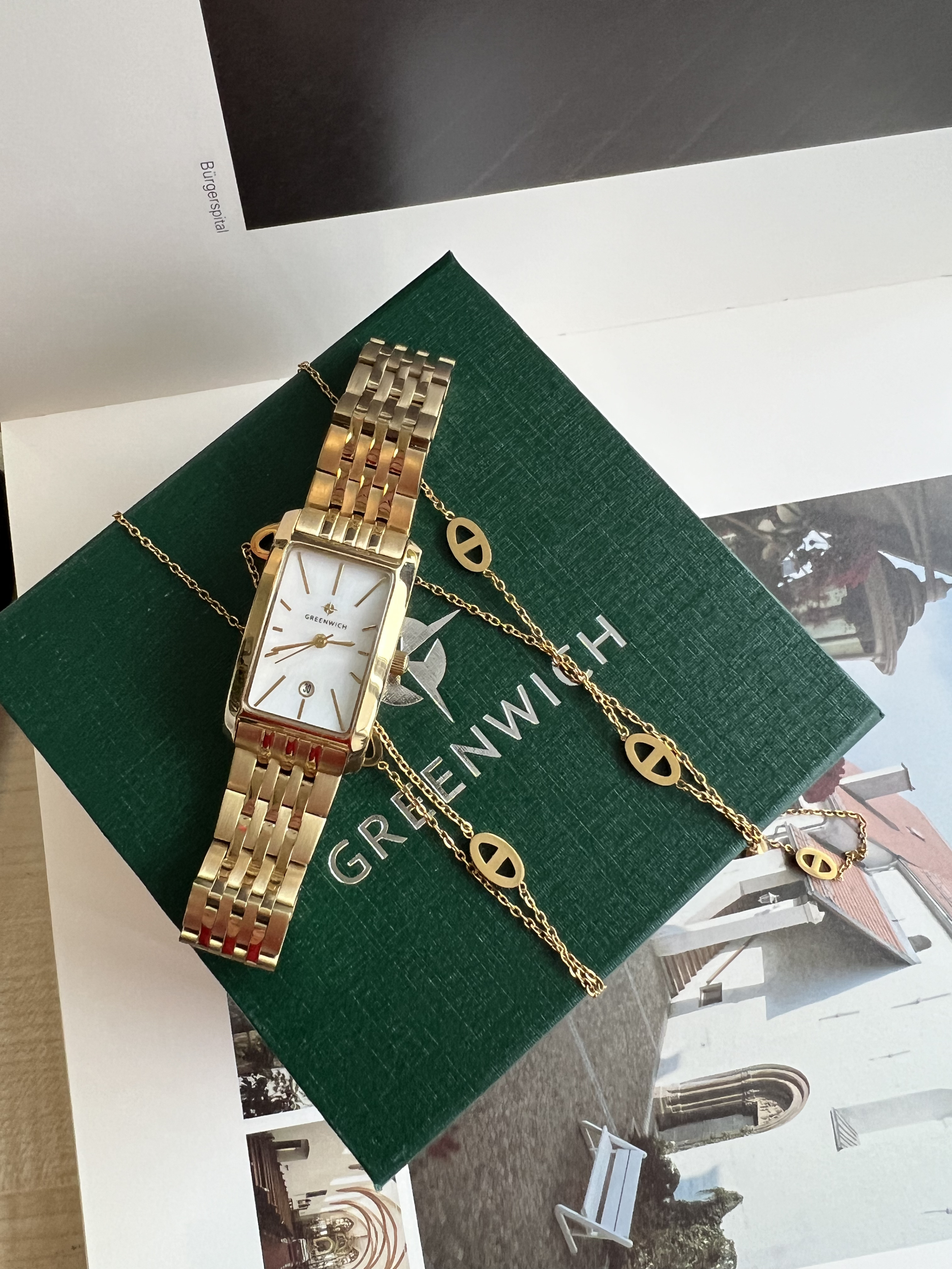 Корпус изготовлен из нержавеющей стали с зеркальной полировкой и ионным PVD-покрытием цвета желтого золота, что придает модели благородный и выразительный характер. Циферблат украшен натуральным белым перламутром, создающим мягкое мерцание при разном освещении. Часовые метки и стрелки хорошо читаются, окошко даты аккуратно выделено накладным обрамлением.