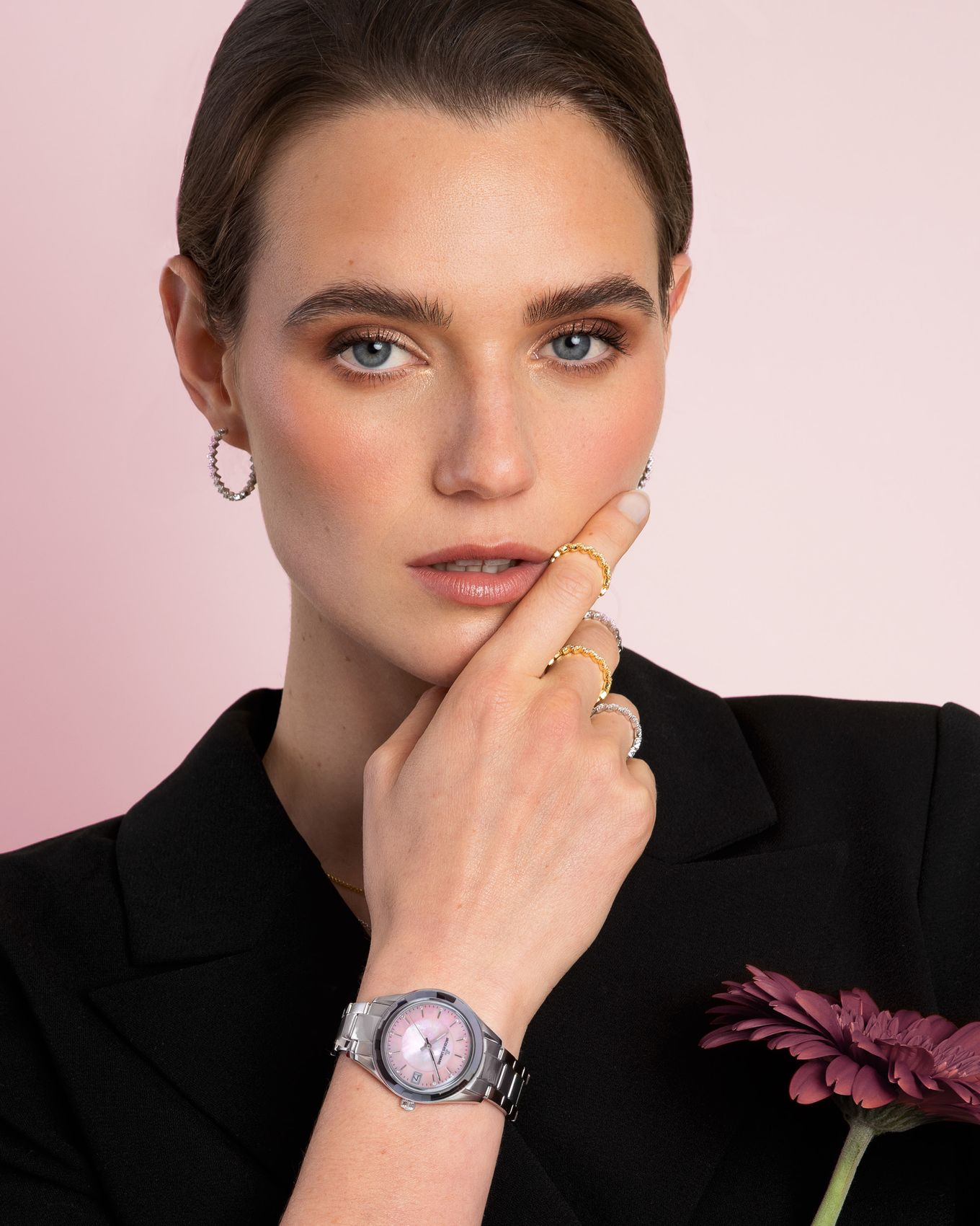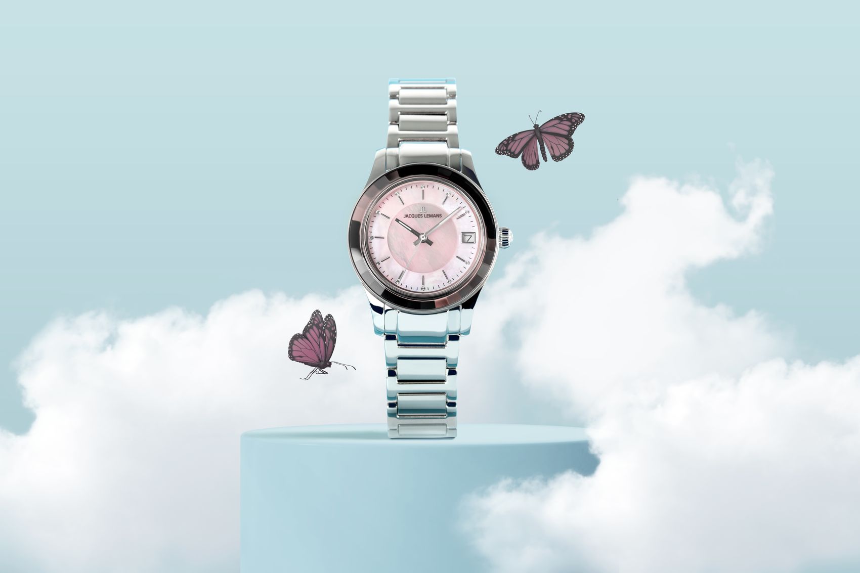 Нежно-розовый циферблат дополнен окошком даты на отметке «3 часа», выделенным накладной рамкой. В роли часовых маркеров выступают двенадцать кристаллов Swarovski — они не только украшают циферблат, но и помогают легко ориентироваться во времени, отражая свет при каждом движении руки.