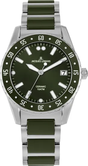 Мужские часы Jacques Lemans 42-10C из коллекции High Tech Ceramic сочетают спортивную динамику и элегантный дизайн. Корпус из нержавеющей стали диаметром 42 мм дополнен выразительным широким безелем с дополнительной индикацией. Тёмно-зелёный циферблат с люминесцентными стрелками и индексами обеспечивает отличную читаемость в любое время суток. Кварцевый механизм Epson отвечает за точность хода и функцию даты на отметке «3 часа».