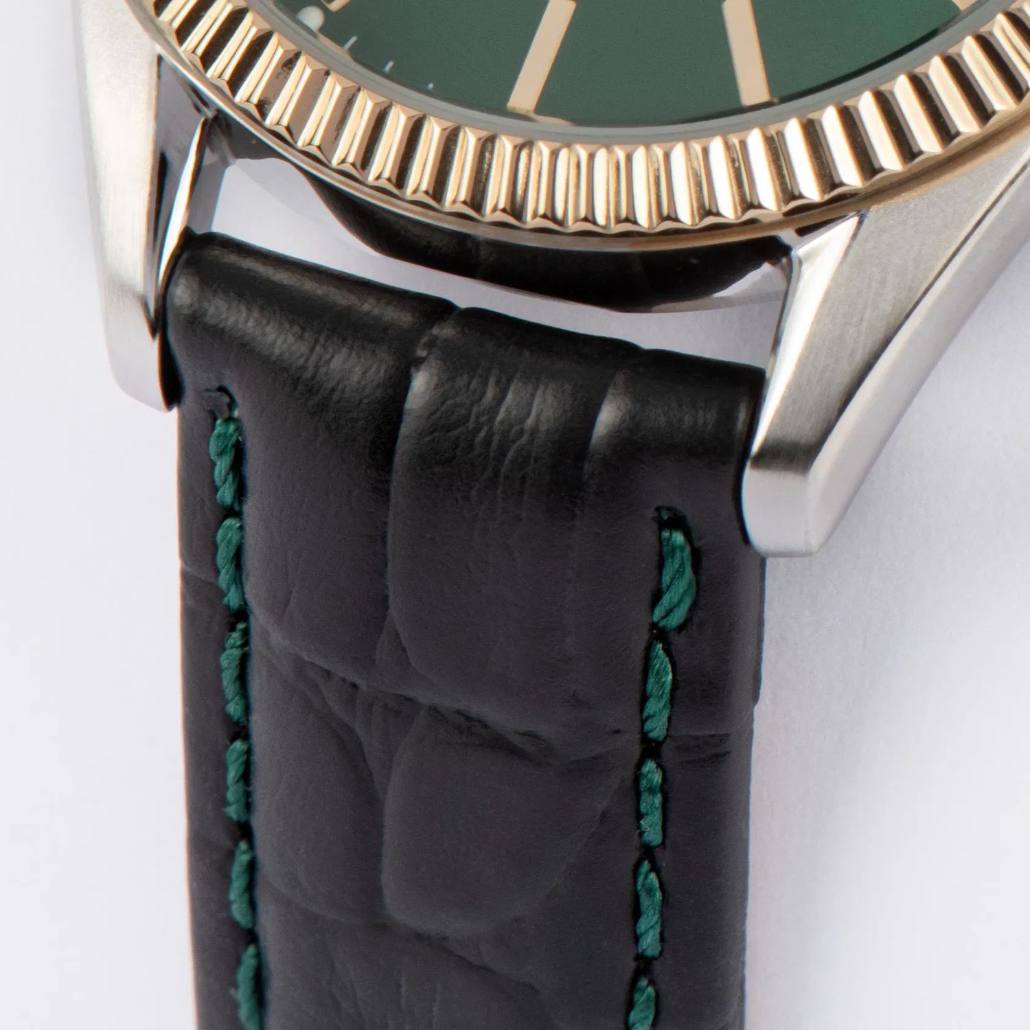 Корпус диаметром 34 мм выполнен из нержавеющей стали и дополнен выразительным ребристым безелем с PVD-покрытием из жёлтого золота и полированной поверхностью, придающей модели благородное сияние. Широкий зелёный циферблат с эффектом «солнечных лучей» создаёт игру света и подчёркивает глубину цвета, а стрелки и часовые индексы с люминесцентным покрытием обеспечивают отличную читаемость в любое время суток.