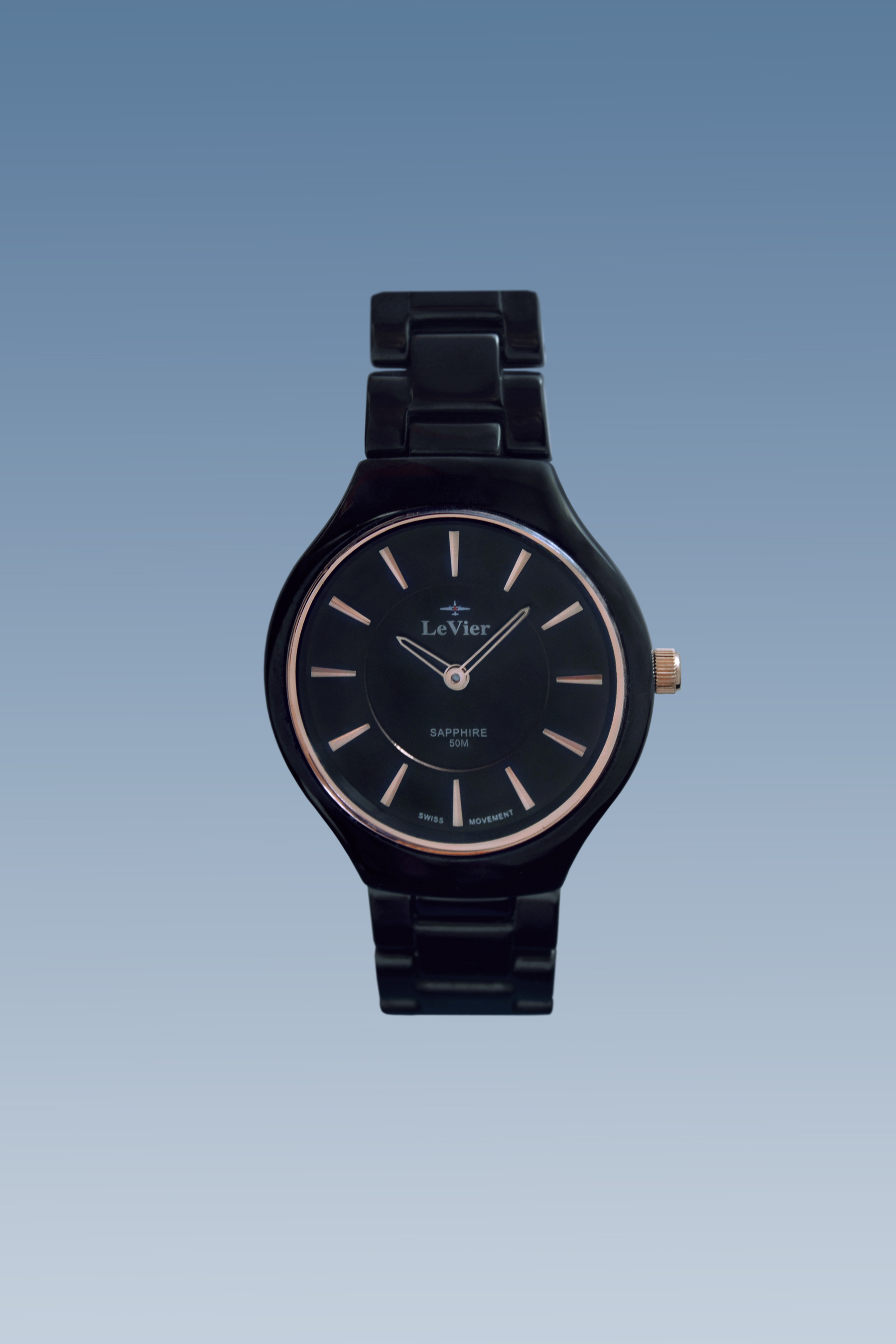 Корпус и браслет выполнены из высоко-технологической керамики, которая не подвержена коррозии и абсолютно безалергена ( то есть 100% не вызывает аллергию, как многие виды стали и сплавов). На циферблате есть дата, показывающая число месяца. Швейцарская батарейка фирмы Renata обеспечивает бесперебойное питание часов от 3 до 5 лет. Сапфировое стекло обеспечивает прекрасный вид времени на циферблате. Сапфировое стекло обладает высокой прочностью и его практически невозможно поцарапать в обычной повседневной деятельности, так как такое стекло можно поцарапать только твердым алмазом, а обычные вещи как: ножи, ключи, монеты, гвозди, саморезы, дверные ручки и так далее не оставят следов на сапфировом стекле. Часы водонепроницаемые WR 50 m. Завинчивающаяся задняя крышка с изображением самолета невидимки B-2, который приходится центром логотипа бренда LeVier. Лозунг часовой марки - "Быть выше неба". С часами идет большая красивая подарочная коробка размером 14 -13 -8 см с логотипом LeVier внутри и снаружи. Международная гарантия и руководство на нескольких языках, включая русский.