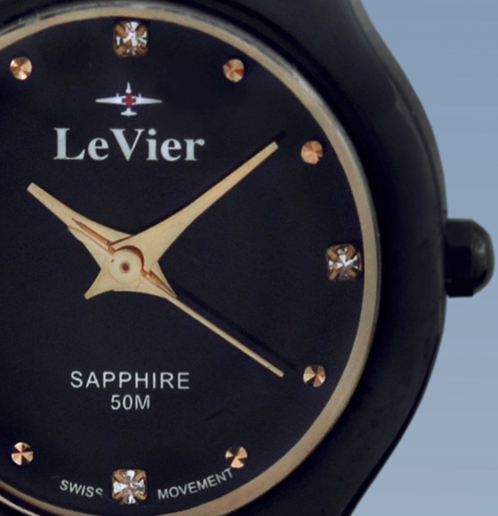 Корпус и браслет выполнены из высоко-технологической керамики, которая не подвержена коррозии и абсолютно безалергена ( то есть 100% не вызывает аллергию, как многие виды стали и сплавов). На циферблате есть дата, показывающая число месяца. Швейцарская батарейка фирмы Renata обеспечивает бесперебойное питание часов от 3 до 5 лет. Сапфировое стекло обеспечивает прекрасный вид времени на циферблате. Сапфировое стекло обладает высокой прочностью и его практически невозможно поцарапать в обычной повседневной деятельности, так как такое стекло можно поцарапать только твердым алмазом, а обычные вещи как: ножи, ключи, монеты, гвозди, саморезы, дверные ручки и так далее не оставят следов на сапфировом стекле. Часы водонепроницаемые WR 50 m, то есть в часы могут попасть в воду и силиконовые прокладки у заводной головки, задней крышки и кнопок не пропустят воду внутрь часов. Мыться и купаться с этими часами не рекомендуется, так как данные часы не предназначены для глубокого погружения, резкого перепада температуры и с практической точки зрения мыться без часов намного удобнее. После купании в море (если Вы все таки не послушались) или в другой агрессивной среде обязательно сполосните часы в чистой воде, чтобы соль не испортила прокладки. Завинчивающаяся задняя крышка с изображением самолета невидимки B-2, который приходится центром логотипа бренда LeVier. Лозунг часовой марки - "Быть выше неба". С часами идет большая красивая подарочная коробка размером 14 -13 -8 см с логотипом LeVier внутри и снаружи. Международная гарантия и руководство на нескольких языках, включая русский.