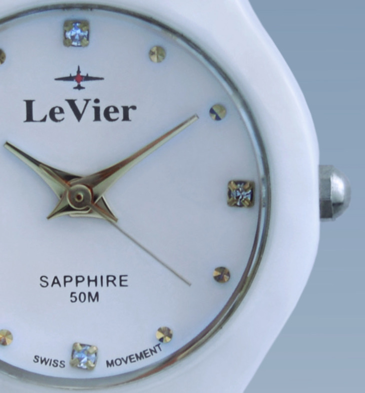 Корпус и браслет выполнены из высоко-технологической керамики, которая не подвержена коррозии и абсолютно безалергена ( то есть 100% не вызывает аллергию, как многие виды стали и сплавов). На циферблате есть дата, показывающая число месяца. Швейцарская батарейка фирмы Renata обеспечивает бесперебойное питание часов от 3 до 5 лет. Сапфировое стекло обеспечивает прекрасный вид времени на циферблате. Сапфировое стекло обладает высокой прочностью и его практически невозможно поцарапать в обычной повседневной деятельности, так как такое стекло можно поцарапать только твердым алмазом, а обычные вещи как: ножи, ключи, монеты, гвозди, саморезы, дверные ручки и так далее не оставят следов на сапфировом стекле. Часы водонепроницаемые WR 50 m, то есть в часы могут попасть в воду и силиконовые прокладки у заводной головки, задней крышки и кнопок не пропустят воду внутрь часов. Мыться и купаться с этими часами не рекомендуется, так как данные часы не предназначены для глубокого погружения, резкого перепада температуры и с практической точки зрения мыться без часов намного удобнее. После купании в море (если Вы все таки не послушались) или в другой агрессивной среде обязательно сполосните часы в чистой воде, чтобы соль не испортила прокладки. Завинчивающаяся задняя крышка с изображением самолета невидимки B-2, который приходится центром логотипа бренда LeVier. Лозунг часовой марки - "Быть выше неба". С часами идет большая красивая подарочная коробка размером 14 -13 -8 см с логотипом LeVier внутри и снаружи. Международная гарантия и руководство на нескольких языках, включая русский.