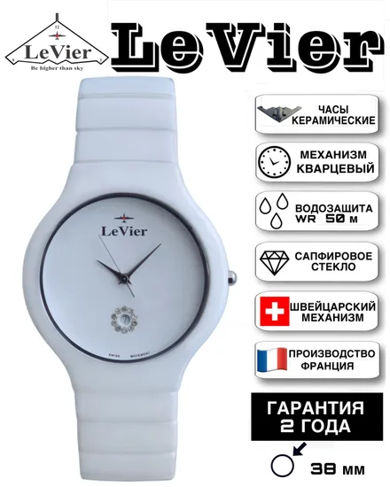 Корпус и браслет выполнены из высоко-технологической керамики, которая не подвержена коррозии и абсолютно безалергена ( то есть 100% не вызывает аллергию, как многие виды стали и сплавов). На циферблате есть дата, показывающая число месяца. Швейцарская батарейка фирмы Renata обеспечивает бесперебойное питание часов от 3 до 5 лет. Сапфировое стекло обеспечивает прекрасный вид времени на циферблате. Сапфировое стекло обладает высокой прочностью и его практически невозможно поцарапать в обычной повседневной деятельности, так как такое стекло можно поцарапать только твердым алмазом, а обычные вещи как: ножи, ключи, монеты, гвозди, саморезы, дверные ручки и так далее не оставят следов на сапфировом стекле. Часы водонепроницаемые WR 50 m, то есть в часы могут попасть в воду и силиконовые прокладки у заводной головки, задней крышки и кнопок не пропустят воду внутрь часов. Мыться и купаться с этими часами не рекомендуется, так как данные часы не предназначены для глубокого погружения, резкого перепада температуры и с практической точки зрения мыться без часов намного удобнее. После купании в море (если Вы все таки не послушались) или в другой агрессивной среде обязательно сполосните часы в чистой воде, чтобы соль не испортила прокладки. Завинчивающаяся задняя крышка с изображением самолета невидимки B-2, который приходится центром логотипа бренда LeVier. Лозунг часовой марки - "Быть выше неба". С часами идет большая красивая подарочная коробка размером 14 -13 -8 см с логотипом LeVier внутри и снаружи. Международная гарантия и руководство на нескольких языках, включая русский.