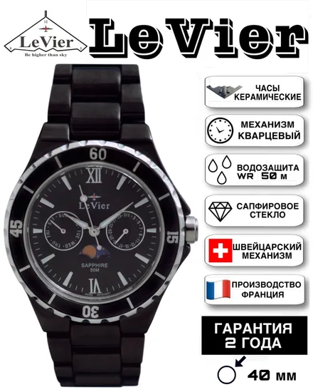 Корпус и браслет выполнены из высоко-технологической керамики, которая не подвержена коррозии и абсолютно безалергена ( то есть 100% не вызывает аллергию, как многие виды стали и сплавов). На циферблате есть дата, показывающая число месяца. Швейцарская батарейка фирмы Renata обеспечивает бесперебойное питание часов от 3 до 5 лет. Сапфировое стекло обеспечивает прекрасный вид времени на циферблате. Сапфировое стекло обладает высокой прочностью и его практически невозможно поцарапать в обычной повседневной деятельности, так как такое стекло можно поцарапать только твердым алмазом, а обычные вещи как: ножи, ключи, монеты, гвозди, саморезы, дверные ручки и так далее не оставят следов на сапфировом стекле. Часы водонепроницаемые WR 50 m, то есть в часы могут попасть в воду и силиконовые прокладки у заводной головки, задней крышки и кнопок не пропустят воду внутрь часов. Мыться и купаться с этими часами не рекомендуется, так как данные часы не предназначены для глубокого погружения, резкого перепада температуры и с практической точки зрения мыться без часов намного удобнее. После купании в море (если Вы все таки не послушались) или в другой агрессивной среде обязательно сполосните часы в чистой воде, чтобы соль не испортила прокладки. Завинчивающаяся задняя крышка с изображением самолета невидимки B-2, который приходится центром логотипа бренда LeVier. Лозунг часовой марки - "Быть выше неба". С часами идет большая красивая подарочная коробка размером 14 -13 -8 см с логотипом LeVier внутри и снаружи. Международная гарантия и руководство на нескольких языках, включая русский.