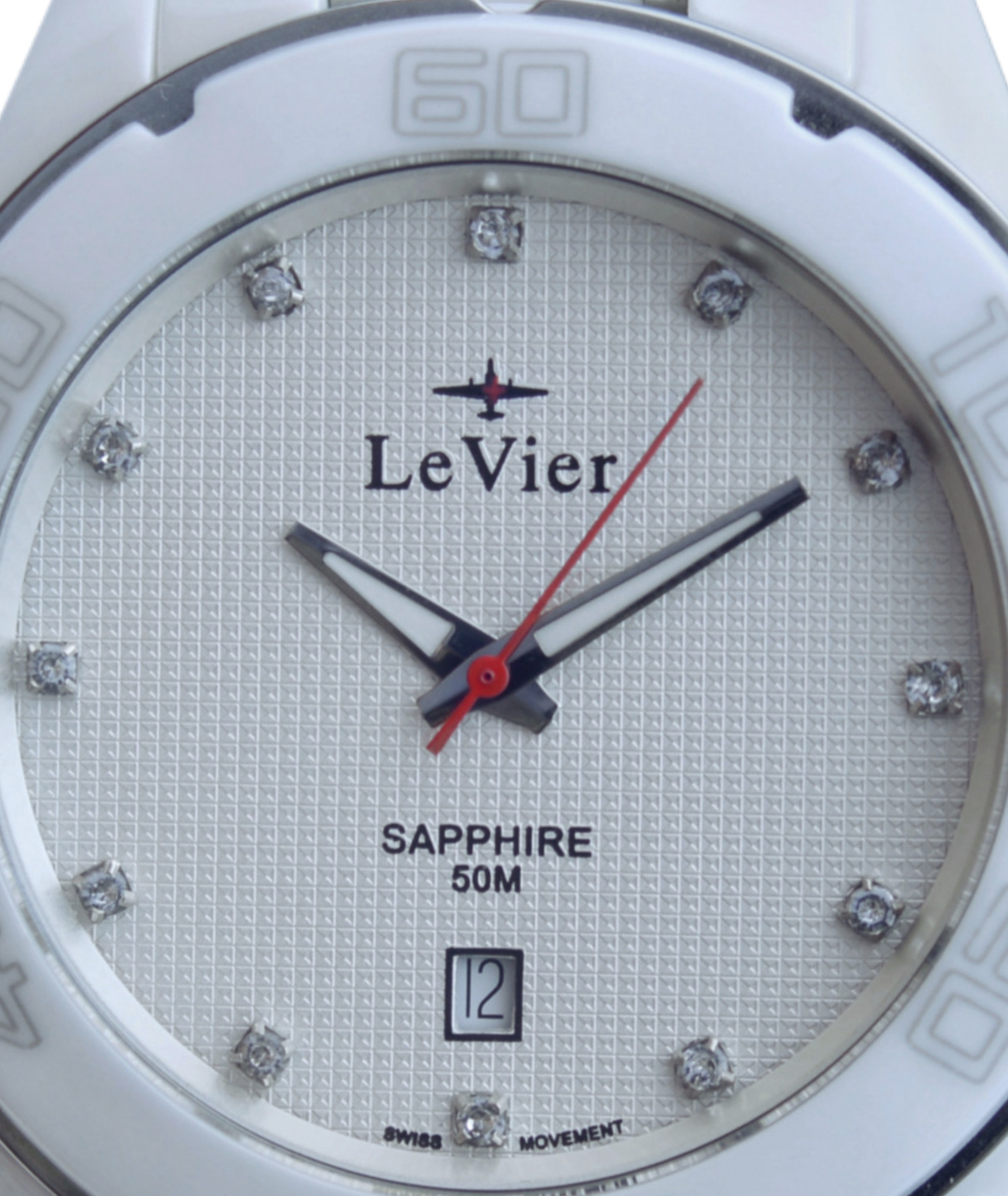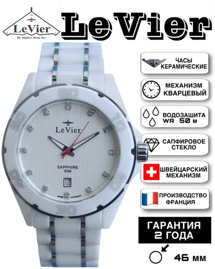 Корпус и браслет выполнены из высоко-технологической керамики, которая не подвержена коррозии и абсолютно безалергена ( то есть 100% не вызывает аллергию, как многие виды стали и сплавов). На циферблате есть дата, показывающая число месяца. Швейцарская батарейка фирмы Renata обеспечивает бесперебойное питание часов от 3 до 5 лет. Сапфировое стекло обеспечивает прекрасный вид времени на циферблате. Сапфировое стекло обладает высокой прочностью и его практически невозможно поцарапать в обычной повседневной деятельности, так как такое стекло можно поцарапать только твердым алмазом, а обычные вещи как: ножи, ключи, монеты, гвозди, саморезы, дверные ручки и так далее не оставят следов на сапфировом стекле. Часы водонепроницаемые WR 50 m, то есть в часы могут попасть в воду и силиконовые прокладки у заводной головки, задней крышки и кнопок не пропустят воду внутрь часов. Мыться и купаться с этими часами не рекомендуется, так как данные часы не предназначены для глубокого погружения, резкого перепада температуры и с практической точки зрения мыться без часов намного удобнее. После купании в море (если Вы все таки не послушались) или в другой агрессивной среде обязательно сполосните часы в чистой воде, чтобы соль не испортила прокладки. Завинчивающаяся задняя крышка с изображением самолета невидимки B-2, который приходится центром логотипа бренда LeVier. Лозунг часовой марки - "Быть выше неба". С часами идет большая красивая подарочная коробка размером 14 -13 -8 см с логотипом LeVier внутри и снаружи. Международная гарантия и руководство на нескольких языках, включая русский.