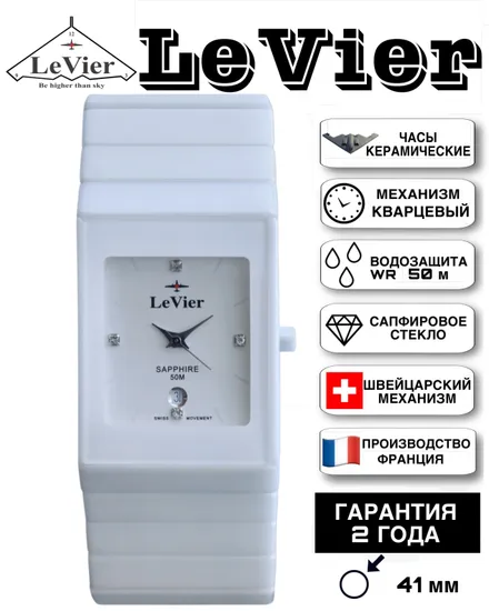 Корпус и браслет выполнены из высоко-технологической керамики, которая не подвержена коррозии и абсолютно безалергена ( то есть 100% не вызывает аллергию, как многие виды стали и сплавов). На циферблате есть дата, показывающая число месяца. Швейцарская батарейка фирмы Renata обеспечивает бесперебойное питание часов от 3 до 5 лет. Сапфировое стекло обеспечивает прекрасный вид времени на циферблате. Сапфировое стекло обладает высокой прочностью и его практически невозможно поцарапать в обычной повседневной деятельности, так как такое стекло можно поцарапать только твердым алмазом, а обычные вещи как: ножи, ключи, монеты, гвозди, саморезы, дверные ручки и так далее не оставят следов на сапфировом стекле. Часы водонепроницаемые WR 50 m, то есть в часы могут попасть в воду и силиконовые прокладки у заводной головки, задней крышки и кнопок не пропустят воду внутрь часов. Мыться и купаться с этими часами не рекомендуется, так как данные часы не предназначены для глубокого погружения, резкого перепада температуры и с практической точки зрения мыться без часов намного удобнее. После купании в море (если Вы все таки не послушались) или в другой агрессивной среде обязательно сполосните часы в чистой воде, чтобы соль не испортила прокладки. Завинчивающаяся задняя крышка с изображением самолета невидимки B-2, который приходится центром логотипа бренда LeVier. Лозунг часовой марки - "Быть выше неба". С часами идет большая красивая подарочная коробка размером 14 -13 -8 см с логотипом LeVier внутри и снаружи. Международная гарантия и руководство на нескольких языках, включая русский.