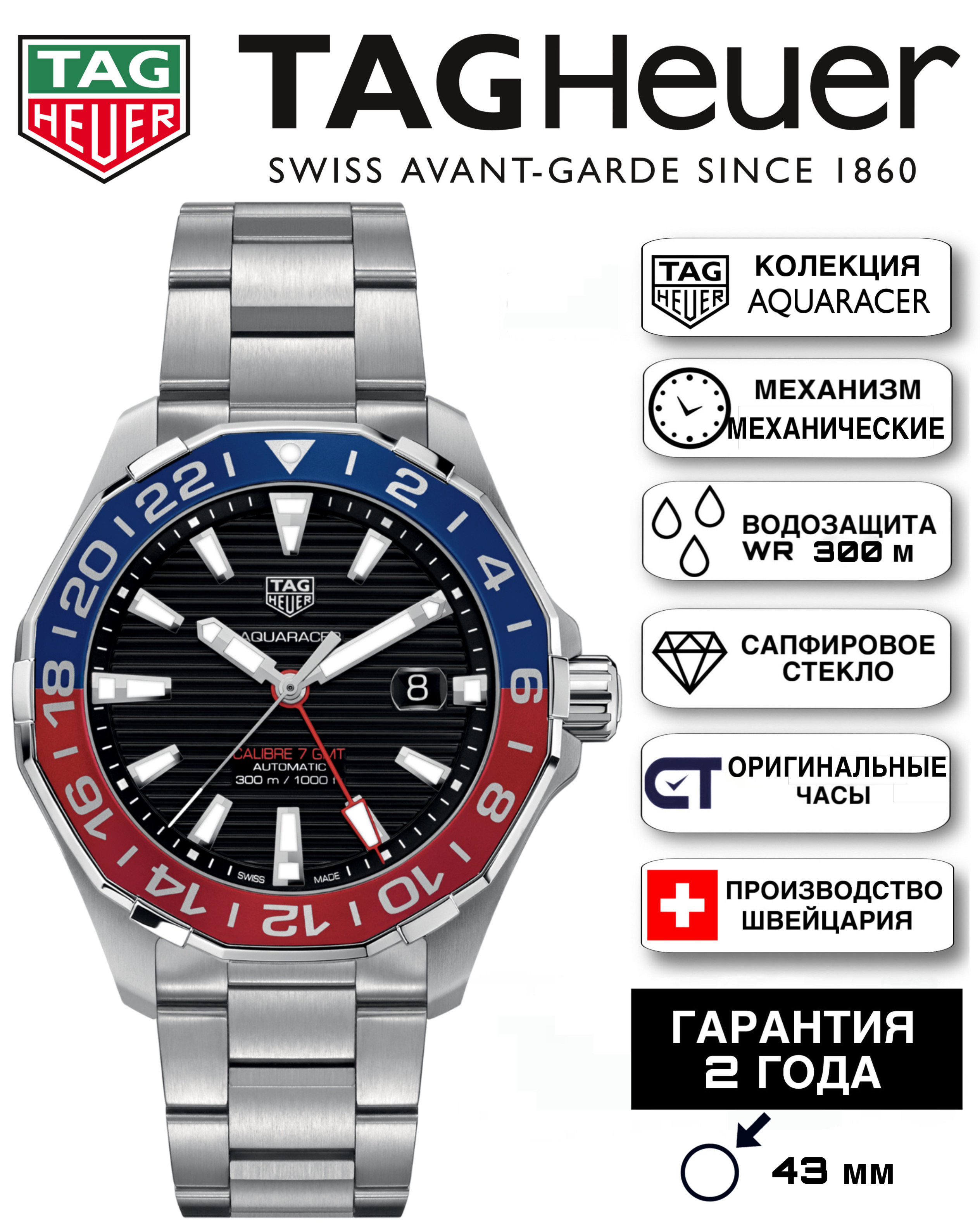 Часы Aquaracer с механизмом Calibre 7 GMT, внушительным 43-миллиметровым корпусом и двухцветным безелем с функцией GMT для отображения дополнительных часовых поясов. Характерный горизонтальный полосатый эффект циферблата и специальные люминесцентные метки на стрелках и индексах облегчают считывание показаний в условиях недостаточного освещения или под водой