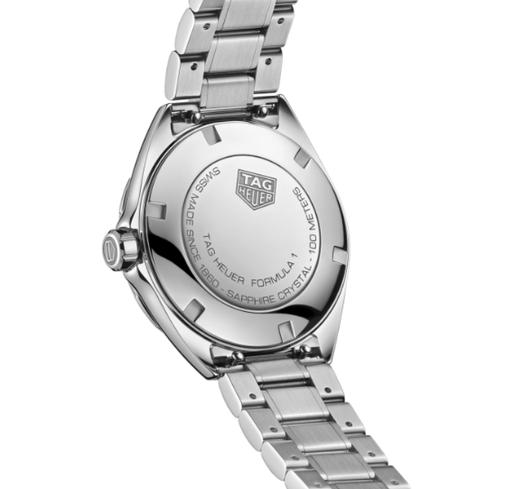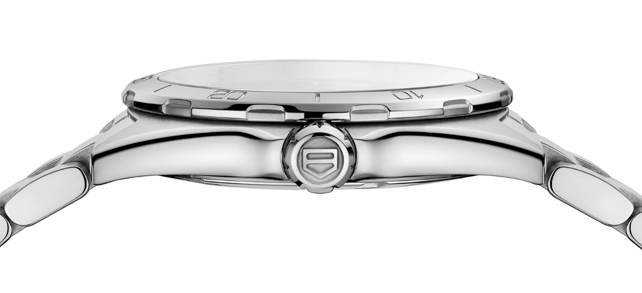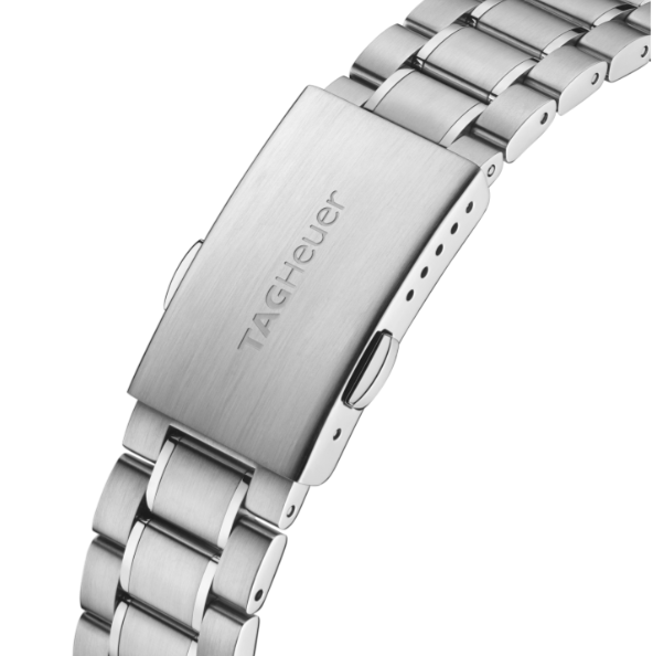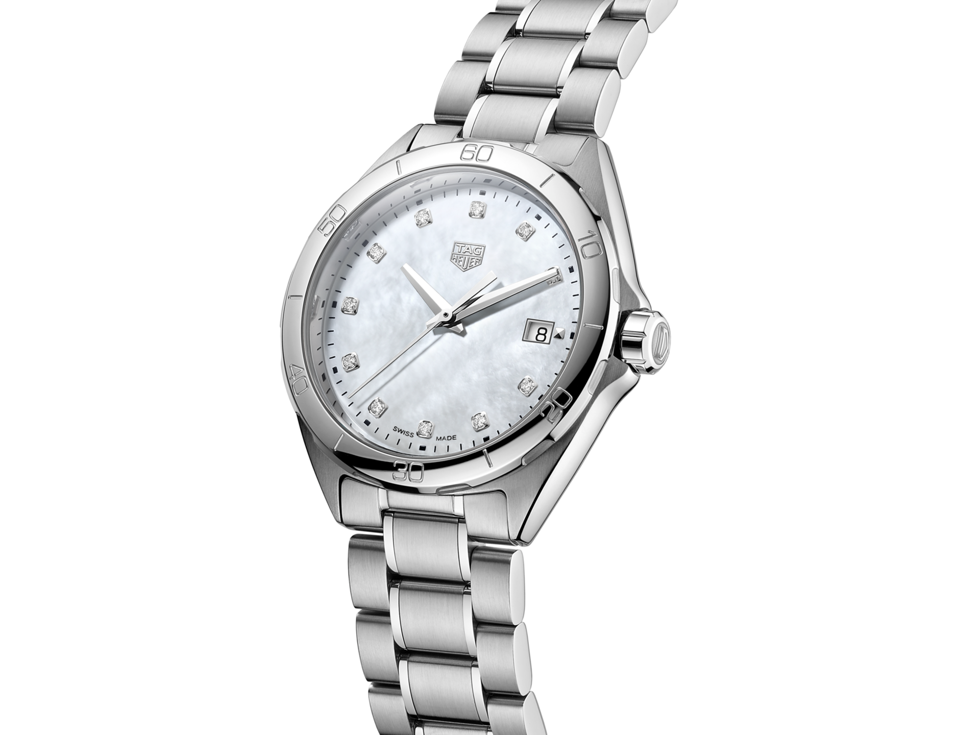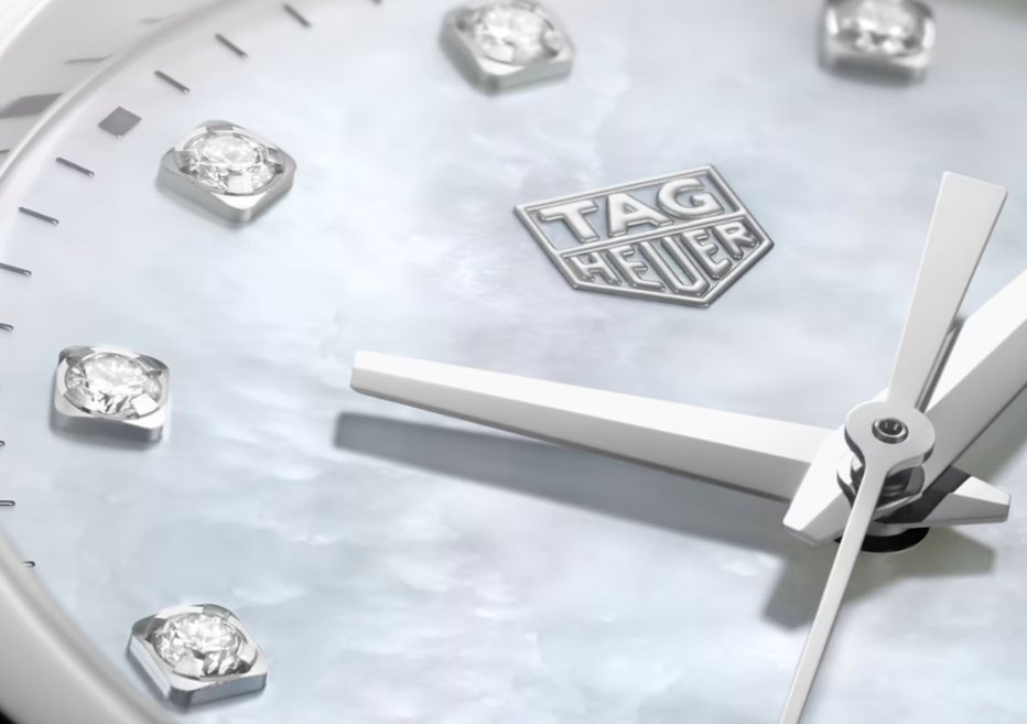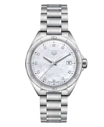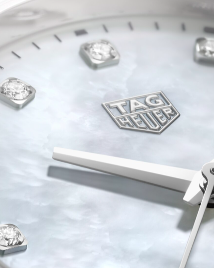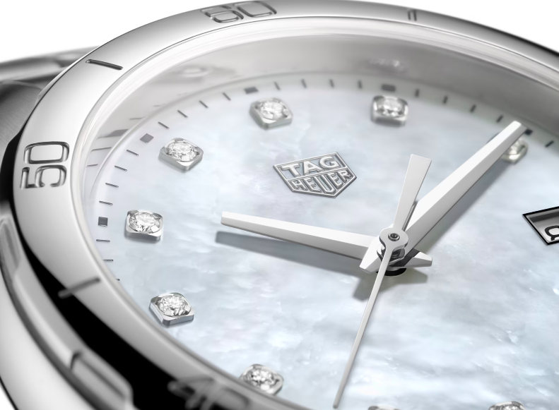 Сапфировое стекло, более твердое, чем сталь, защищает роскошный перламутровый циферблат с серебристыми стрелками и полированным серебристым логотипом TAG Heuer. Сверкающие бриллианты отмечают часы.