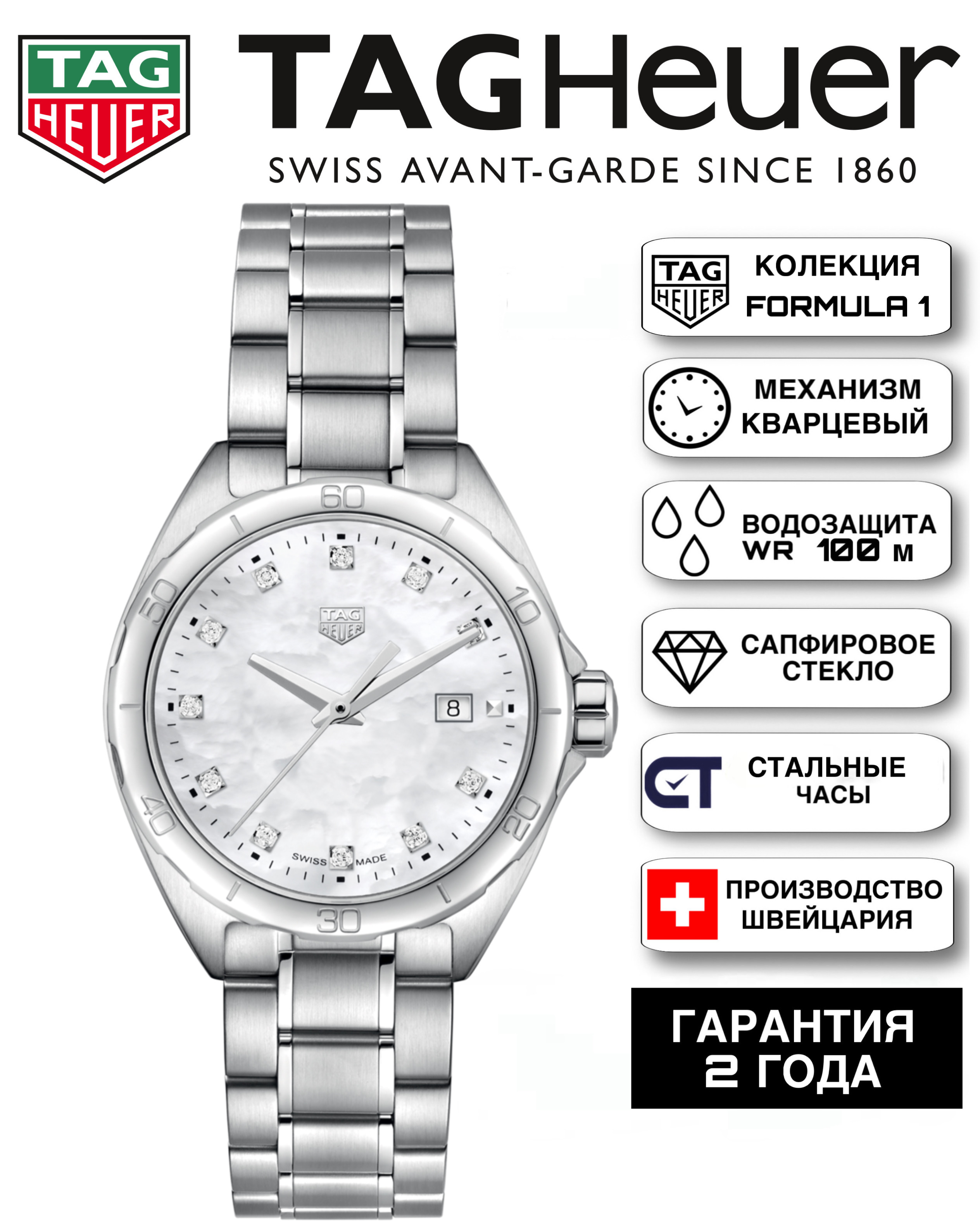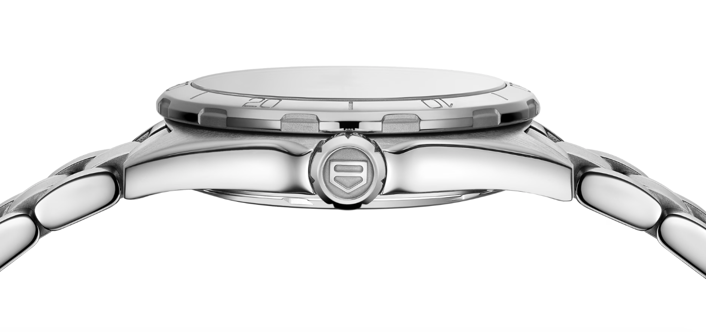 Серебристые стрелки и отполированный вручную серебристый логотип TAG HEUER подчеркивают сияние перламутрового циферблата. Стильные и элегантные, но при этом ориентированные на производительность: водонепроницаемость гарантирована до 100 метров.