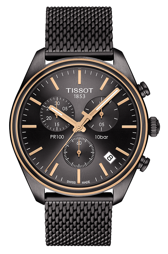 Хронограф PR100 отличается черным циферблатом и безелем с золотистыми деталями, создающими контрастный, но в то же время теплый образ. Черный сетчатый браслет с PVD-покрытием добавляет изюминку.