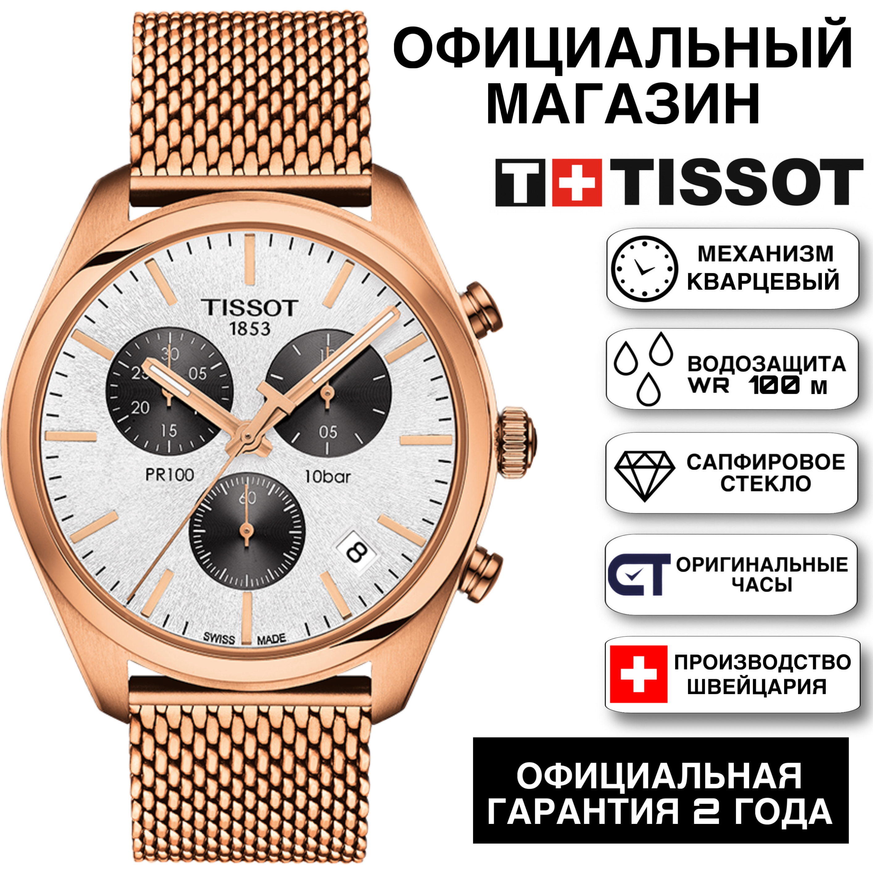 Аббревиатура PR 100 означает "Precise and Robust" (Точные и Надежные), что гарантирует безупречное швейцарское качество и водонепроницаемость до 100 метров.