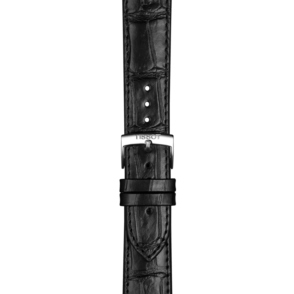 Ремешок выполнен из зернистой кожи с имитацией аллигатора, чёрного цвета, с синтетической подкладкой для комфорта. Оснащён стандартной застёжкой и системой быстрого съёма (interchangeable quick release), что позволяет легко менять браслет без инструментов.